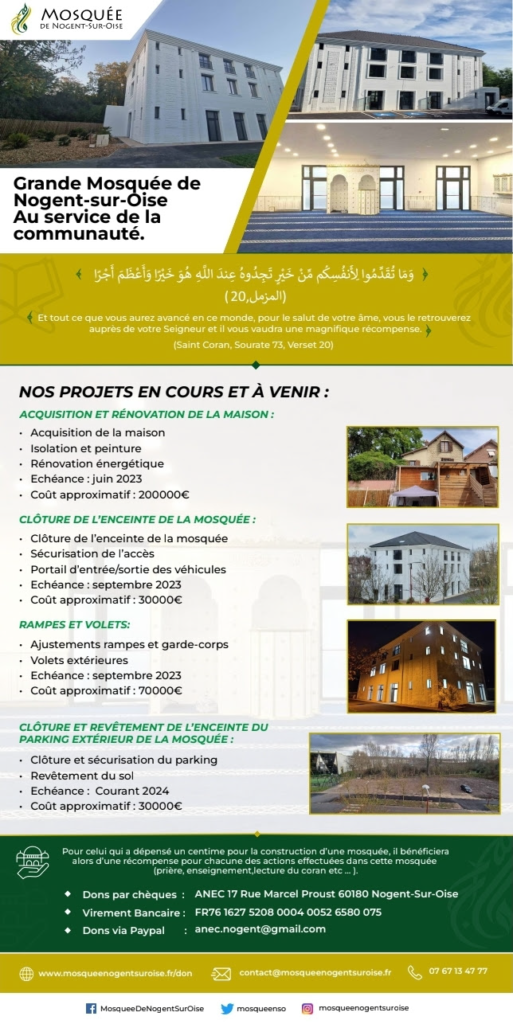 Pour contribuer aux charges de la Mosquée et au financement des projets d’aménagement au sein de la Mosquée